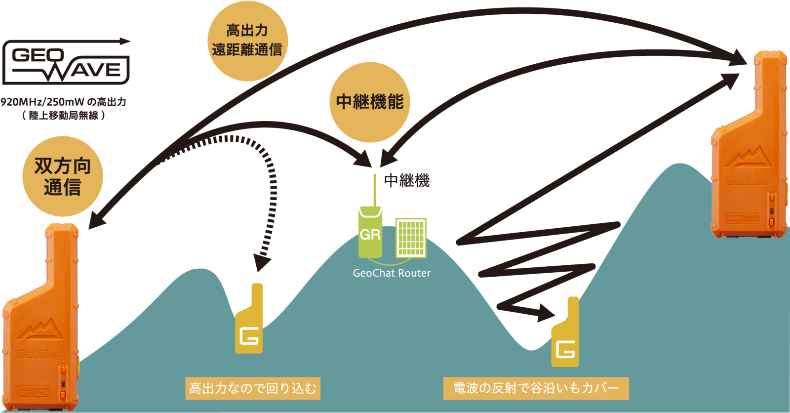 GeoChatは「里山通信」の独自無線規格GEO-WAVE(ジオウェイブ)を使用しています。920MHz/250mWの出力が強い無線によって「超」遠距離通信を実現。険しい山間部でも広範囲に双方向通信が可能なので、携帯圏外エリアでもGeoChat同士でチャットやSOSメッセージの送受信ができます。