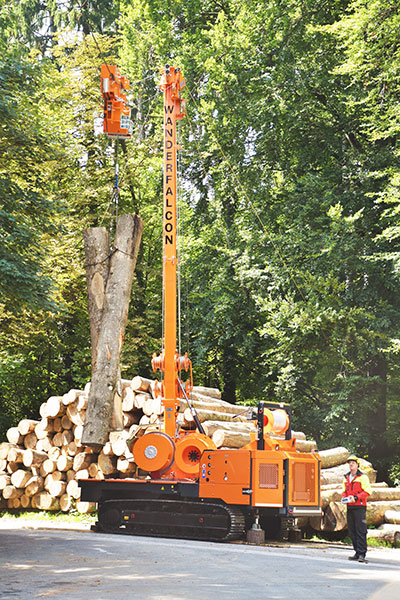 オーストリアを中心に最も長い実績を誇るMM-Forsttechnik社製タワーヤーダー。搬器は3本のケーブルの引張力で動くためエンジンを搭載せず軽量、ファルコンは最大モデルで4t(搬器含む)までの吊上荷重に対応します。上荷、下荷ともにスピーディーな搬送、主索から左右70mまでの横取りも可能。タワーおよび搬器はコンピューターシステムにより細かく自動制御され、最低2人から少人数での作業体制でも安全に行えるよう設計されています。