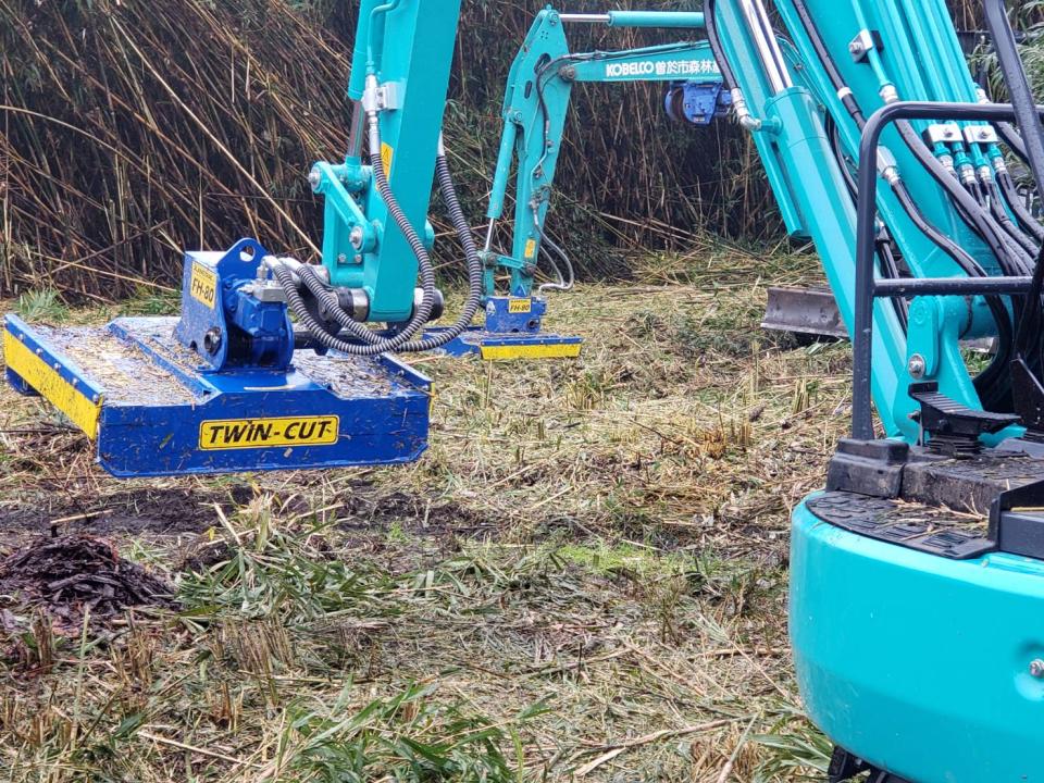 この悪循環を断ち切るために期待されているのが地拵えの機械化だ。そこで、草刈りアタッチメント「SLANETRAC FH80」を扱うKAENKO重機株式会社が招かれ、重機地拵えのデモンストレーションが実施された。